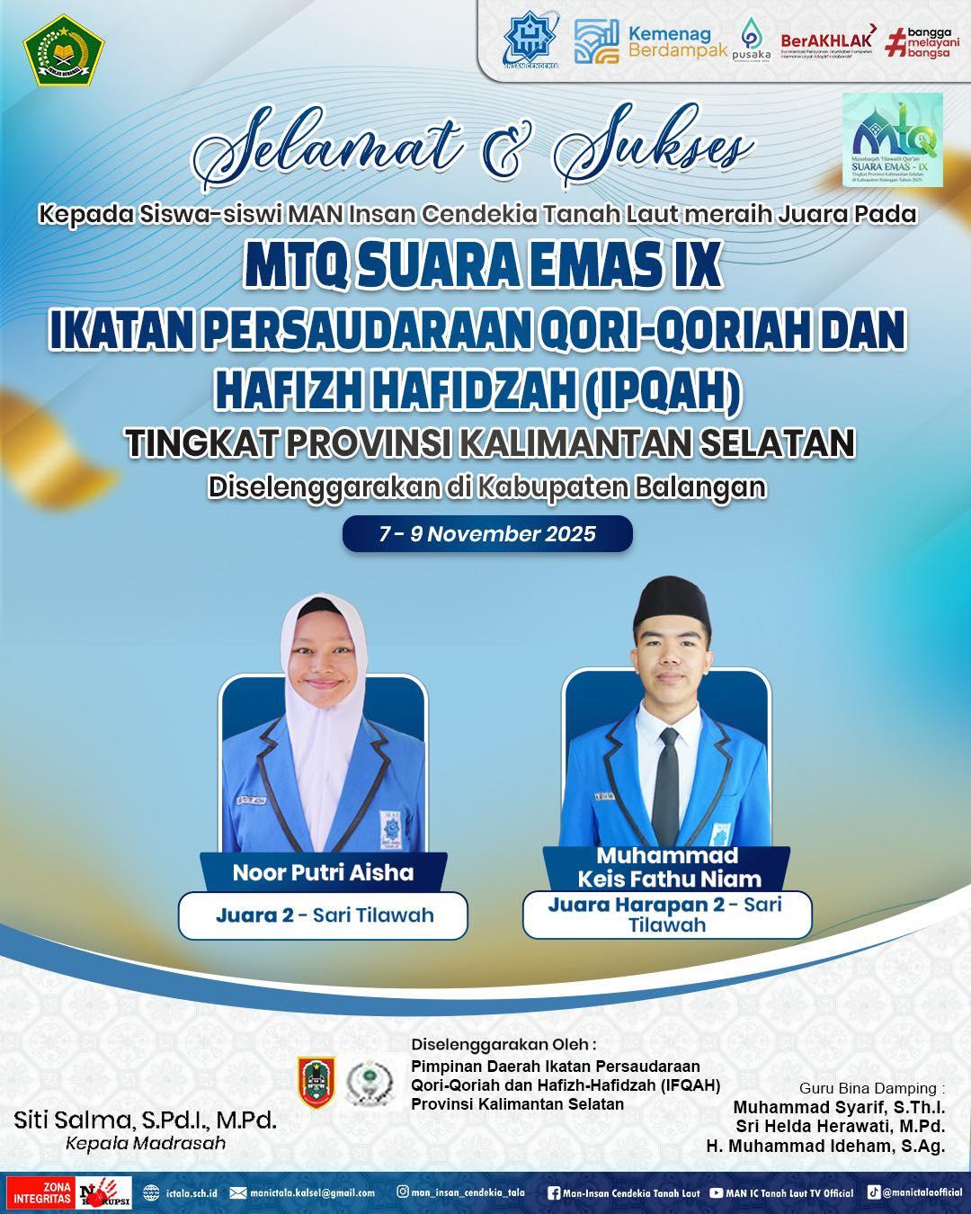 PELAIHARI (MAN ICT) – Kiprah siswa-siswi MAN Insan Cendekia (MAN IC) Tanah Laut di bidang keagamaan kembali bersinar. Dalam ajang bergengsi MTQ Suara Emas IX Ikatan Persaudaraan Qori-Qoriah dan Hafizh Hafidzah (IPQAH) Tingkat Provinsi Kalimantan Selatan yang diselenggarakan di Kabupaten Balangan pada 7–9 November 2025,