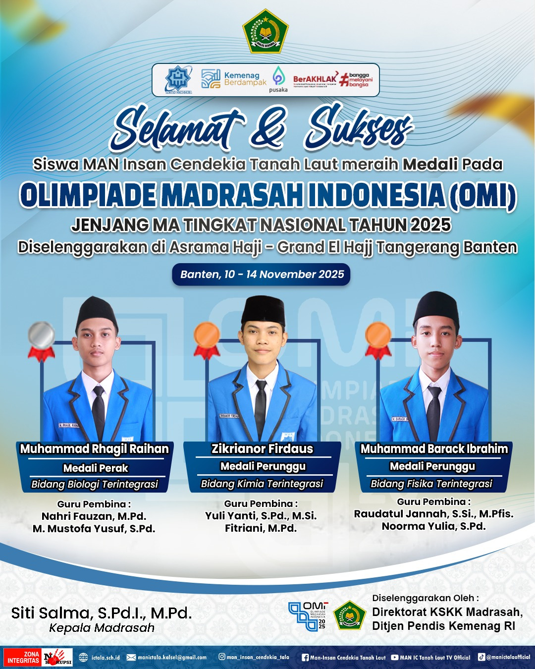 Banten (Tanah Laut) — Prestasi membanggakan kembali ditorehkan oleh siswa Madrasah Aliyah Negeri Insan Cendekia Tanah Laut (MAN ICT) pada ajang Olimpiade Madrasah Indonesia (OMI) 2025) tingkat nasional yang berlangsung di Asrama Haji – Grand El Hajj, Tangerang, Banten, pada 10–14 November 2025. Ajang OMI 2025 diselenggarakan oleh Direktorat KSKK Madrasah, Ditjen Pendis Kemenag RI, dan menjadi wadah bergengsi untuk menampilkan kemampuan terbaik siswa madrasah dari seluruh Indonesia. Tiga siswa berhasil meraih medali di bidang science terintegrasi dan mengharumkan nama madrasah di kancah nasional.
