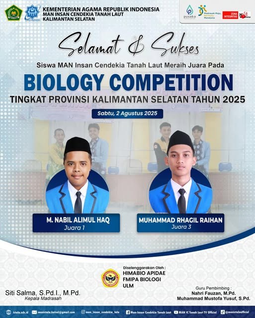 Tanah Laut (MAN ICT) – Prestasi kembali ditorehkan oleh siswa MAN Insan Cendekia Tanah Laut dalam ajang Biology Competition Tingkat Provinsi Kalimantan Selatan Tahun 2025 yang diselenggarakan oleh Himpunan Mahasiswa Biologi (HIMABIO APIDAE) Fakultas Matematika dan Ilmu Pengetahuan Alam (FMIPA) Biologi Universitas Lambung Mangkurat, pada hari Sabtu, 2 Agustus 2025.