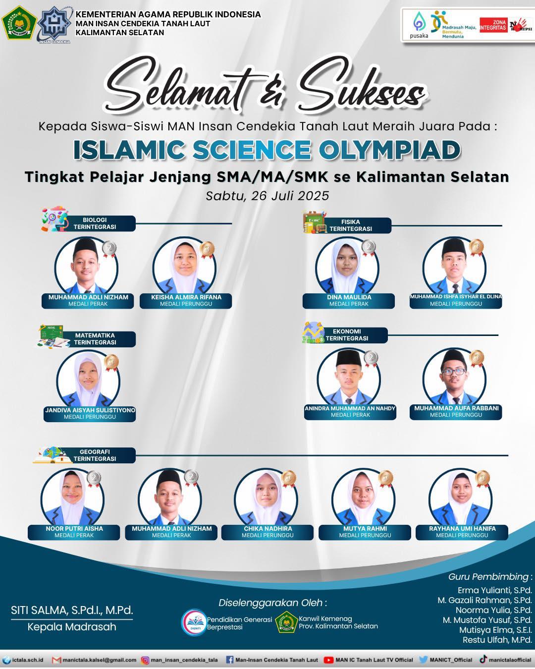 Tanah Laut (MAN ICT) – Siswa-siswi Madrasah Aliyah Negeri Insan Cendekia Tanah Laut (MAN ICT) kembali menorehkan prestasi membanggakan dalam ajang Islamic Science Olympiad Tingkat Pelajar SMA/MA/SMK se-Kalimantan Selatan, yang diselenggarakan pada Sabtu, 26 Juli 2025. Kompetisi ini menjadi ajang pembuktian kompetensi siswa dalam bidang sains terintegrasi dengan nilai-nilai Islam.
