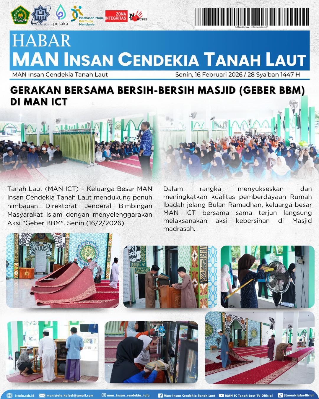 Tanah Laut (MAN ICT) – Keluarga Besar MAN Insan Cendekia Tanah Laut (MAN ICT) melaksanakan Gerakan Bersama Bersih-Bersih Masjid (Geber BBM) pada Senin, 16 Februari 2026 bertepatan dengan 28 Sya’ban 1447 H. Kegiatan ini merupakan bentuk dukungan terhadap imbauan Direktorat Jenderal Bimbingan Masyarakat Islam dalam rangka menyukseskan dan meningkatkan kualitas pemberdayaan rumah ibadah menjelang Bulan Suci Ramadan.