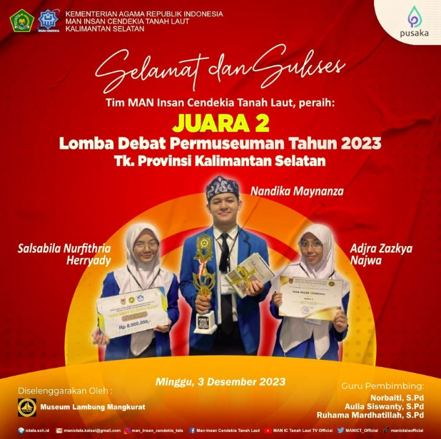 Banjarbaru (MAN ICT). Delegasi Madrasah Aliyah Negeri Insan Cendekia Tanah Laut (MAN ICT) berhasil meraih posisi runner up pada ajang Lomba Debat Provinsi Kalimantan Selatan untuk SLTA/sederajat yang mengusung tema "CINTAI BUDAYA KALIMANTAN SELATAN" yang diselenggarakan oleh Museum Lambung Mangkurat Dinas Pendidikan dan Kebudayaan Pemerintah Provinsi Kalimantan Selatan, Minggu (03/12/2023) di Museum Lambung Mangkurat Banjarbaru.