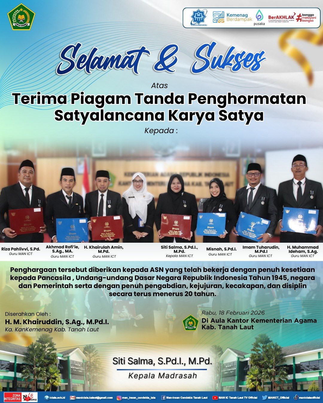 Tanah Laut (MAN ICT) – Kepala Madrasah Aliyah Negeri Insan Cendekia Tanah Laut (MAN ICT) bersama sejumlah guru menerima penyematan dan penyerahan tanda kehormatan Satyalancana Karya Satya sebagai bentuk apresiasi atas pengabdian dan dedikasi selama 20 tahun sebagai Aparatur Sipil Negara (ASN) di bidang pendidikan. Kegiatan tersebut dilaksanakan pada Rabu, 18 Februari 2026 bertepatan dengan 30 Sya’ban 1447 H, bertempat di Aula Kantor Kementerian Agama Kabupaten Tanah Laut.