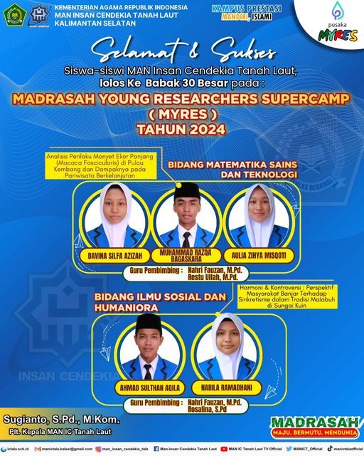 Pelaihari (MAN ICT) - Dua tim Madrasah Aliyah Negeri Insan Cendekia Tanah Laut (MAN ICT) lolos seleksi proposal Madrasah Young Researchers Supercamp (MYRES) tahun 2024  yang diselenggarakan oleh Direktorat KSKK Madrasah Dirjen Pendidikan Islam Kementerian Agama Republik Indonesia. Pada hari Kamis, (04/07/2024).