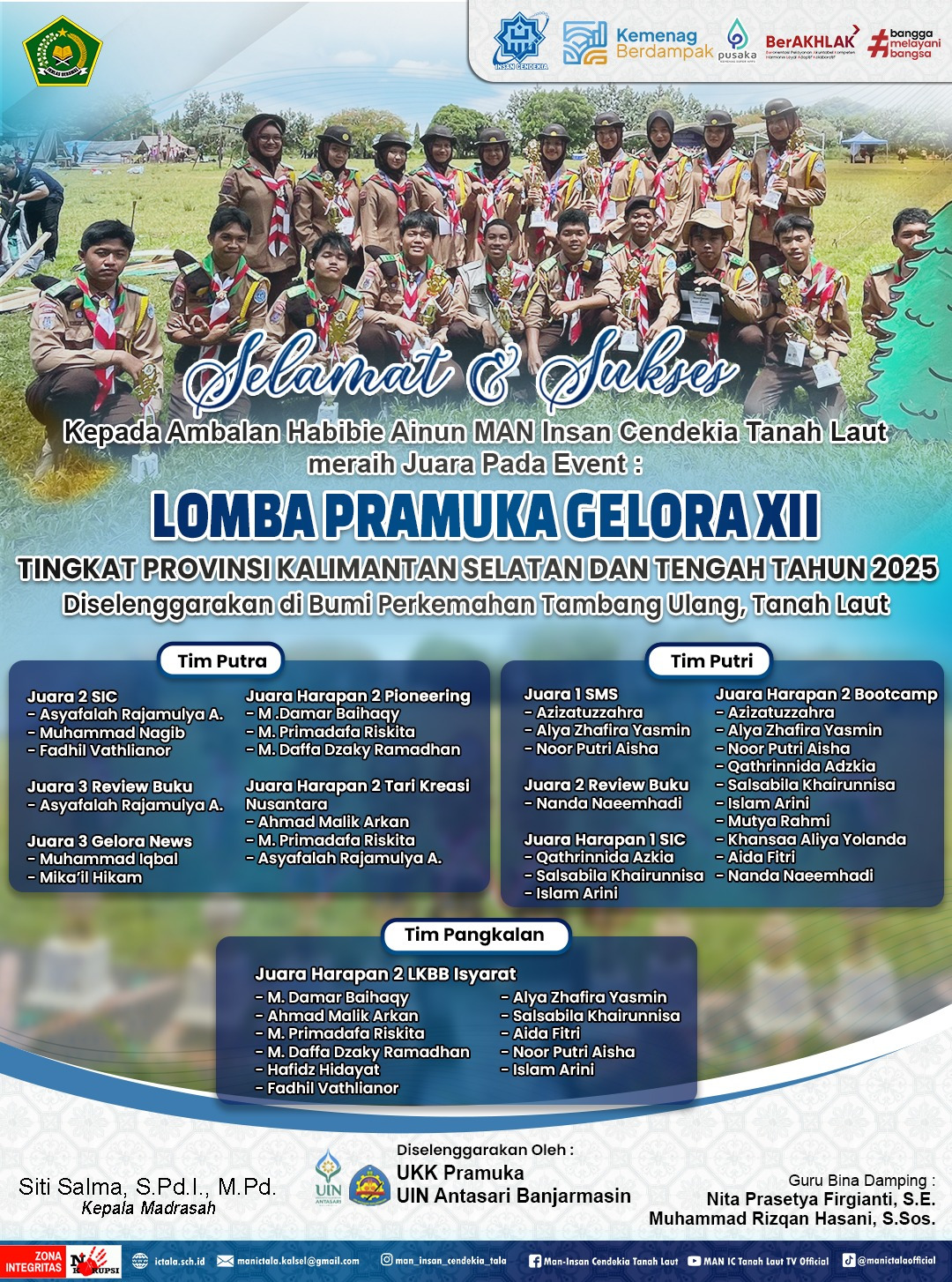 Tanah Laut (MAN ICT)– Ambalan Habibie Ainun Madrasah Aliyah Negeri Insan Cendekia Tanah Laut(MAN ICT) kembali menorehkan prestasi membanggakan dalam ajang Lomba Pramuka Gelora XII Tingkat Provinsi Kalimantan Selatan dan Tengah Tahun 2025 yang digelar di Bumi Perkemahan Tambang Ulang, Tanah Laut. Kegiatan ini diselenggarakan oleh UKK Pramuka UIN Antasari Banjarmasin dan diikuti oleh puluhan kontingen dari berbagai kabupaten/kota di Kalimantan Selatan dan Tengah.