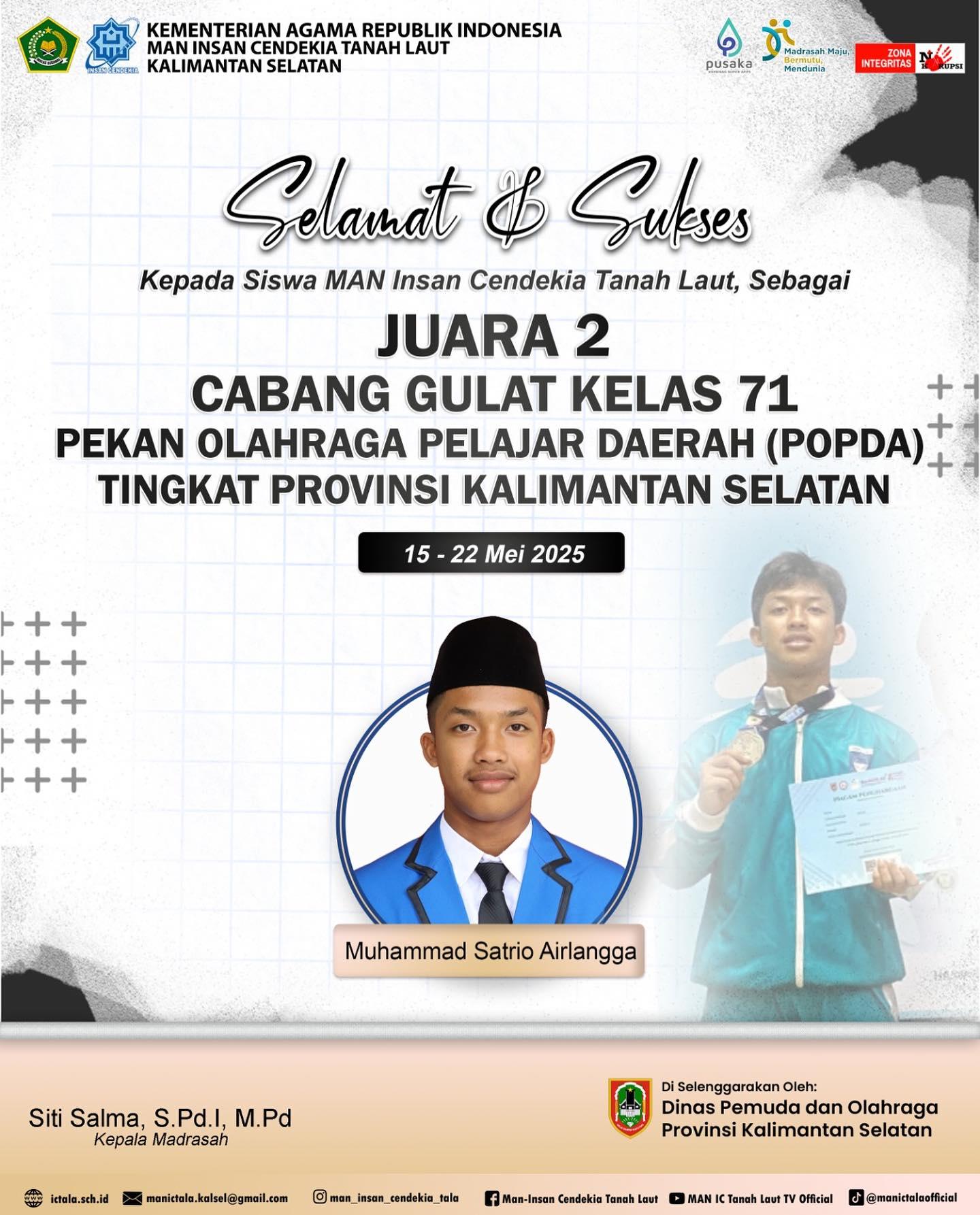 Tanah Laut (MAN ICT) - Siswa Madrasah Aliyah Negeri Insan Cendekia Tanah Laut (MAN ICT) atas nama Muhammad Satrio Airlangga, sukses meraih medali perak pada cabang gulat kelas 71 pada pekan olahraga pelajar daerah (POPDA) tingkat provinsi Kalimantan Selatan yang diselenggarakan oleh Dinas Pemuda dan Olahraga Provinsi Kalsel, yang digelar di GOR Hasanuddin HM Jalan Pangeran Antasari, Banjarmasin pada tanggal 15 s.d 22 Mei 2025.