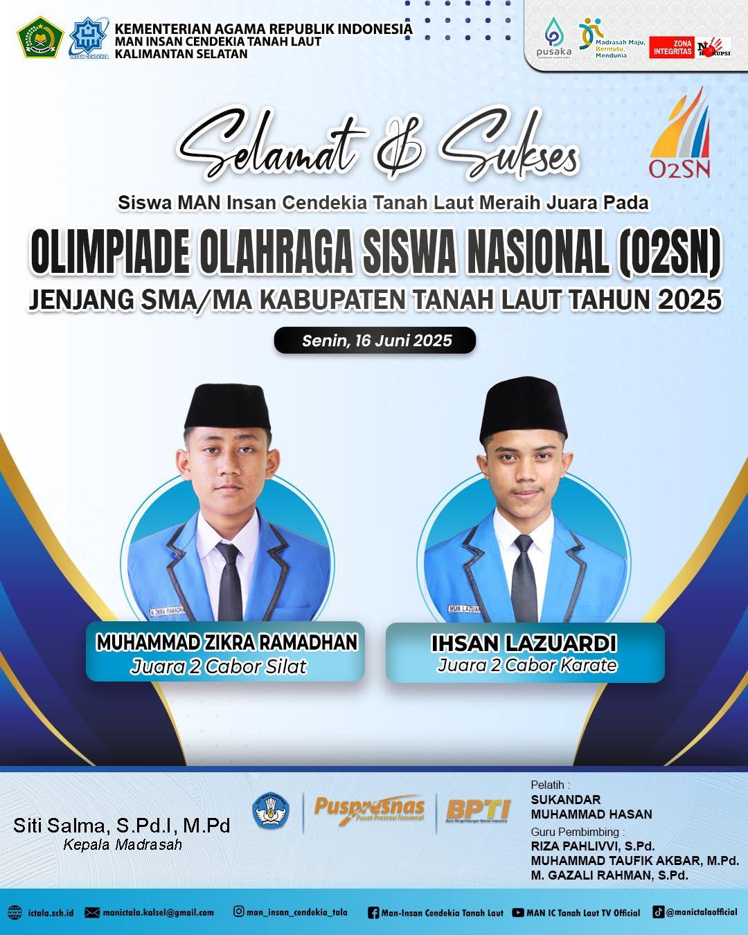 Dua siswa tersebut atas Muhammad Zikra Ramadhan yang meraih juara dua cabor silat dan Ihsan Lazuardi yang meraih juara 2 cabor karate, dengan guru pembimbing Riza Pahlivvi, Muhammad Taufik Akbar serta Muhammad Gazali Rahman.