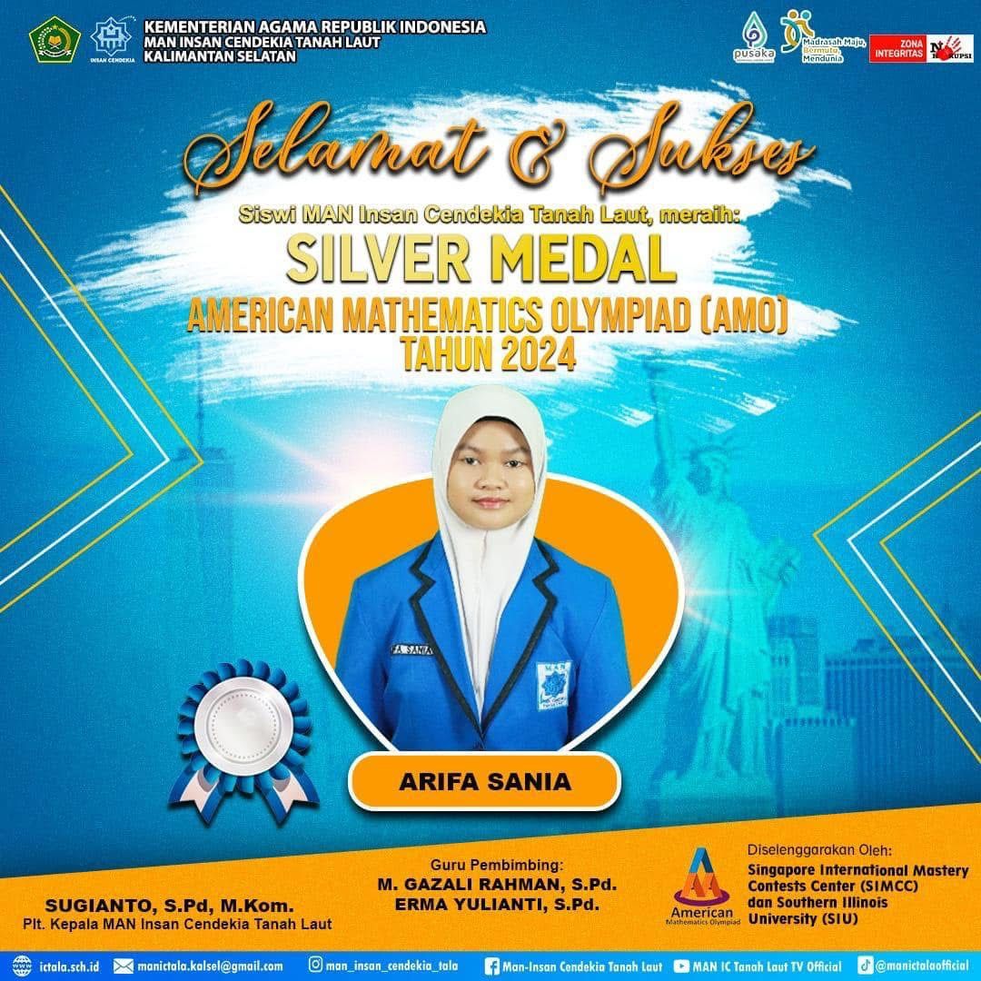 Tanah Laut (MAN ICT) - Siswi Madrasah Aliyah Negeri Insan Cendekia Tanah Laut (MAN ICT), Arifa Sania raih medali silver pada American Mathematics Olympiad (AMO) pada tahun 2024 yang diselenggarakan oleh Singapure International Mastery Contests Center (SIMCC) dan Southern Illinois University (SIU) dibimbing oleh guru pembimbing Muhammad Gazali Rahman dan Erma Yulianti. Pada hari Senin, (2/12/2024).