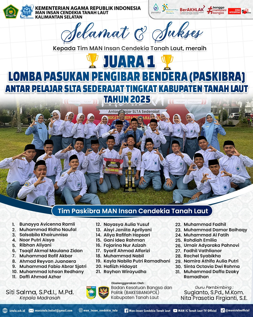 Serta kaka pendamping Bunayya Avicenna Ramli, Muhammad Ridho Naufal, Salsabila Khairunnisa, Naur Putri Aisya dan Ribhan Aliyani. Keberhasilan ini tidak lepas dari bimbingan dan arahan dua guru pembimbing, yaitu Sugianto, S.Pd., M.Kom. dan Nita Prasetia Frigianti, S.E.