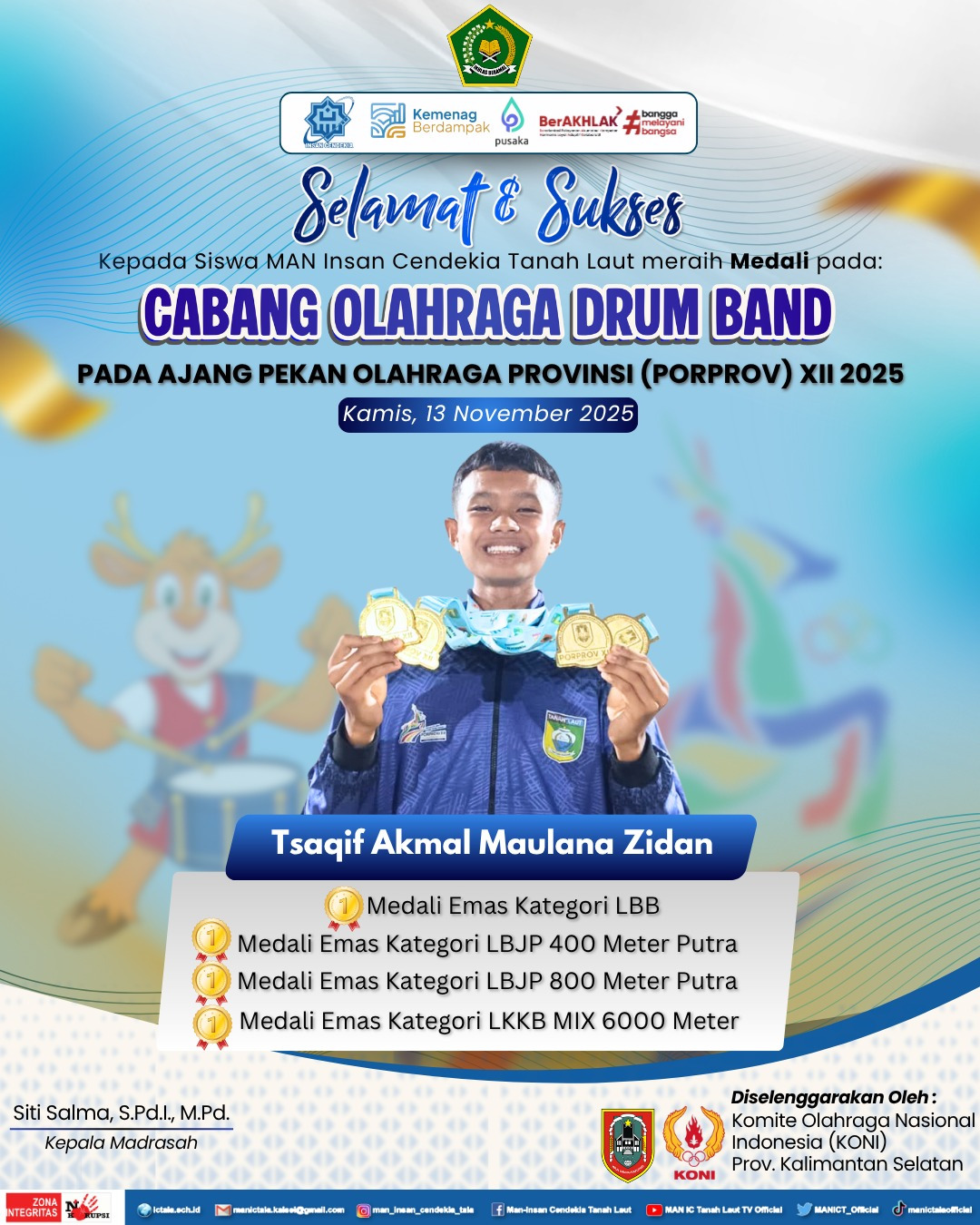 Tanah Laut (MAN ICT) — Prestasi luar biasa ditorehkan oleh Tsaqif Akmal Maulana Zidan, siswa Madrasah Aliyah Negeri Insan Cendekia Tanah Laut (AMN ICT), yang berhasil memborong empat medali emas pada ajang Pekan Olahraga Provinsi (PORPROV) XII Tahun 2025 untuk Cabang Olahraga Drum Band, Pada Kamis 13 November 2025.