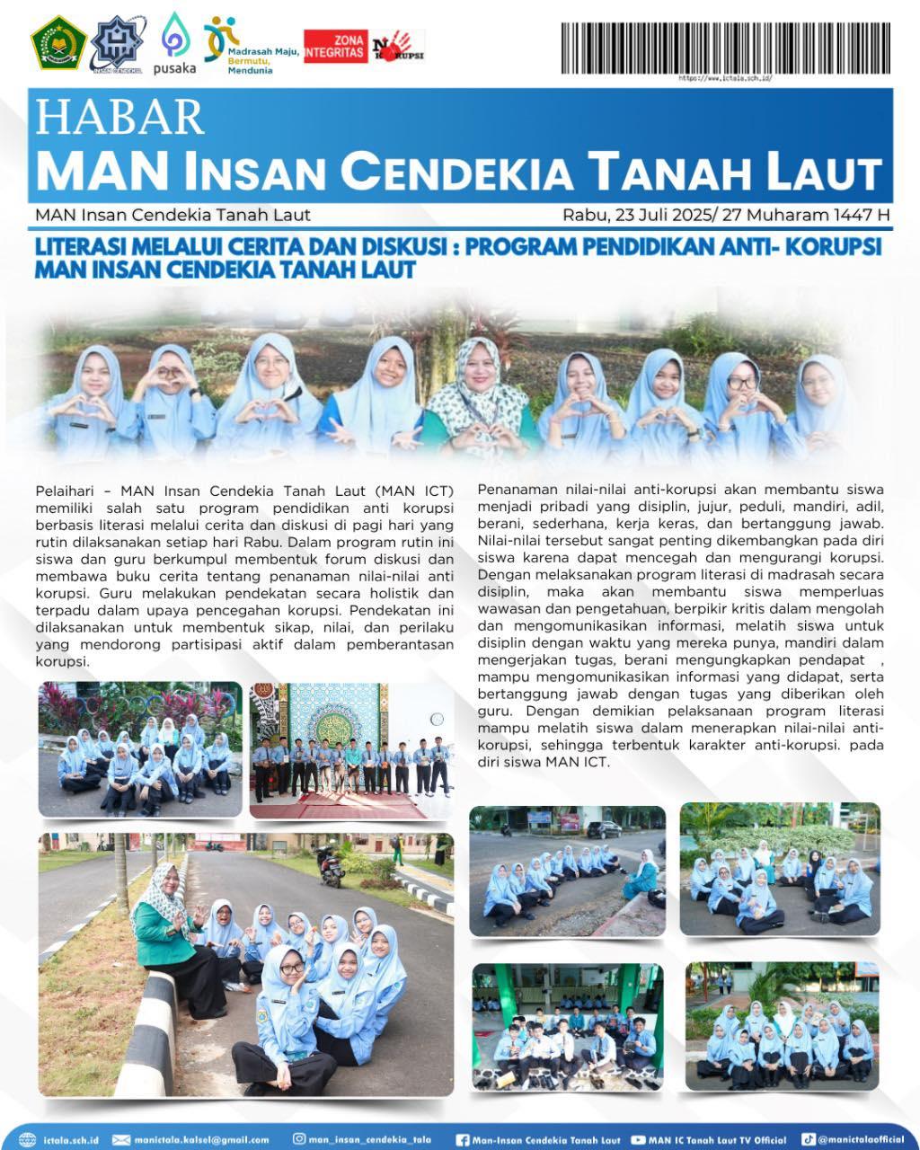 Pelaihari – MAN Insan Cendekia Tanah Laut (MAN ICT) memiliki salah satu program pendidikan anti korupsi berbasis literasi melalui cerita dan diskusi di pagi hari yang rutin dilaksanakan setiap hari Rabu. Dalam program rutin ini siswa dan guru berkumpul membentuk forum diskusi dan membawa buku cerita tentang penanaman nilai-nilai anti korupsi. Guru melakukan pendekatan secara holistik dan terpadu dalam upaya pencegahan korupsi. Pendekatan ini dilaksanakan untuk membentuk sikap, nilai, dan perilaku yang mendorong partisipasi aktif dalam pemberantasan korupsi.