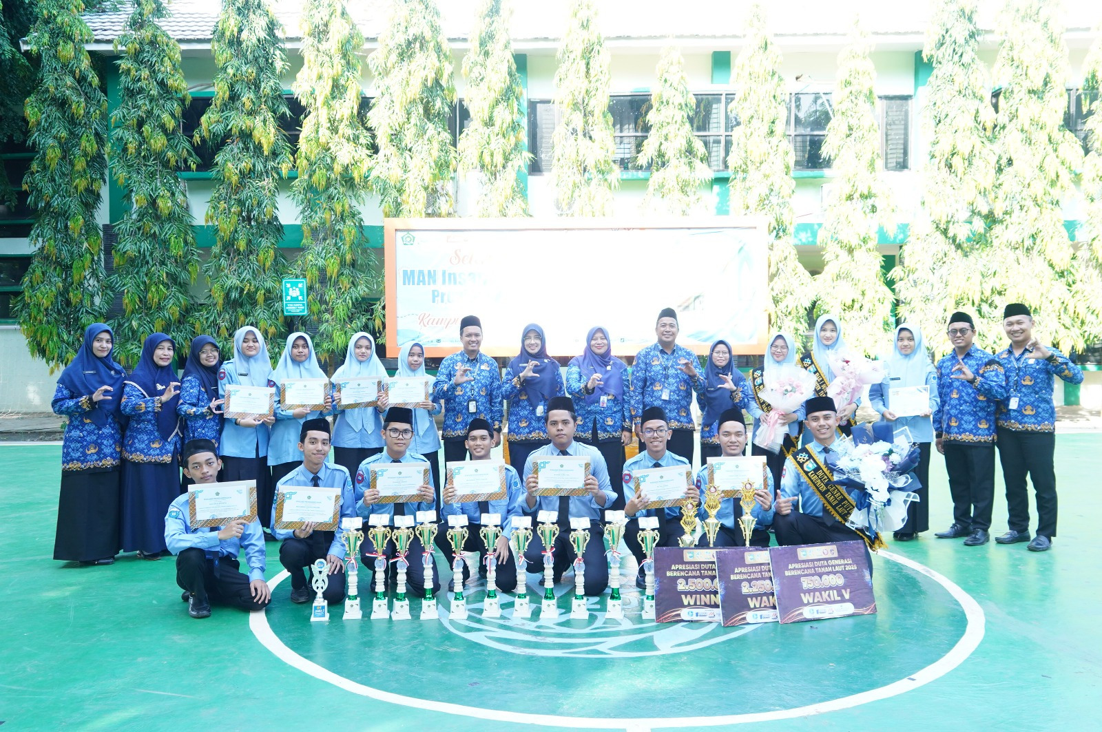 Tanah Laut (MAN ICT) – Kepala Madrasah Aliyah Negeri Insan Cendekia Tanah Laut (MAN ICT), Siti Salma, menyerahkan piala dan penghargaan kepada siswa-siswi berprestasi yang berhasil meraih juara pada berbagai bidang lomba, baik akademik maupun non-akademik. Penyerahan penghargaan berlangsung usai upacara bendera di kampus MAN ICT, didampingi oleh Ka. TU Siti Muflihah, Wakamad Akademik Nahri Fauzan, Wakamad Kesiswaan Riza Pahlivvi, Wakamad Keasramaan H. Fakhriannor, serta guru pendamping. di Kampus MAN ICT, Rabu, 1 Oktober 2025.
