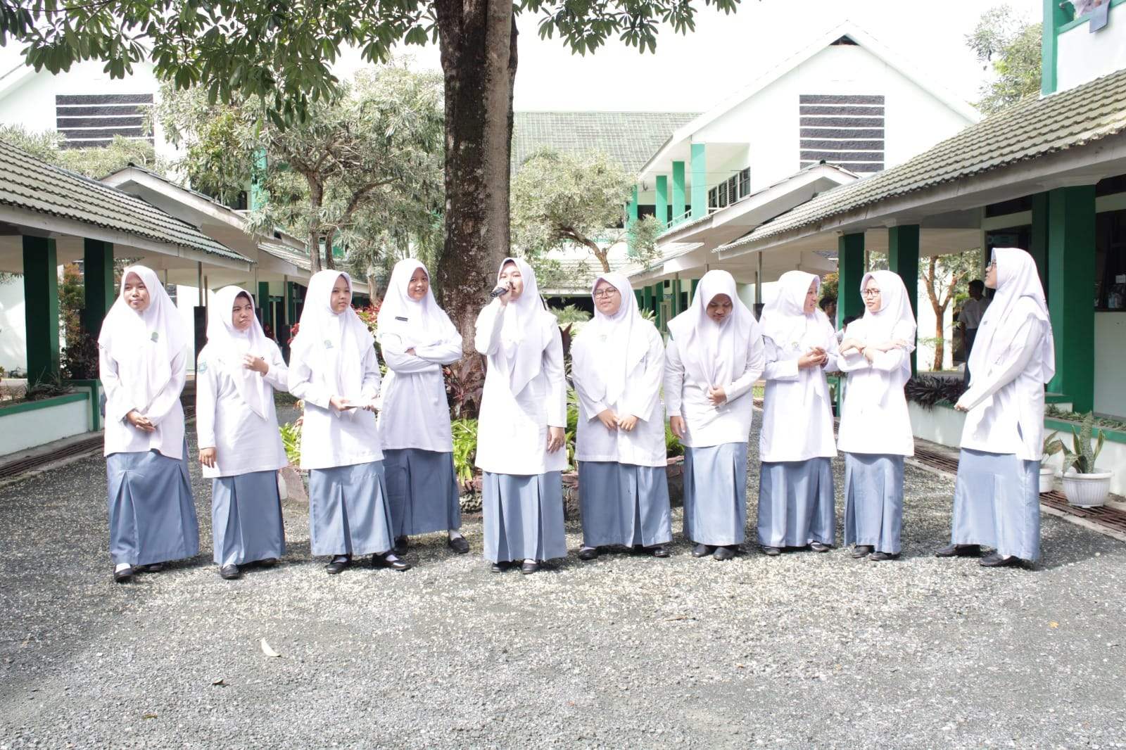 dengan cara berdiri didepan halaman gedung Kegiatan Belajar Mengajar (KBM) sambil