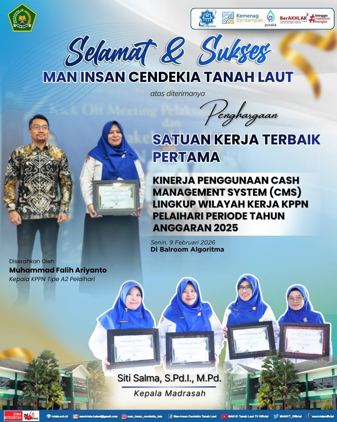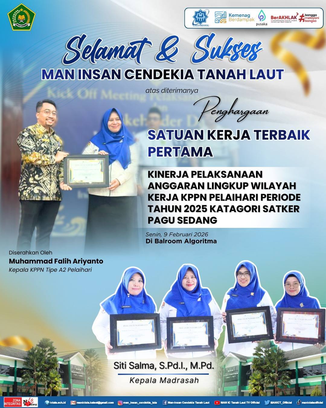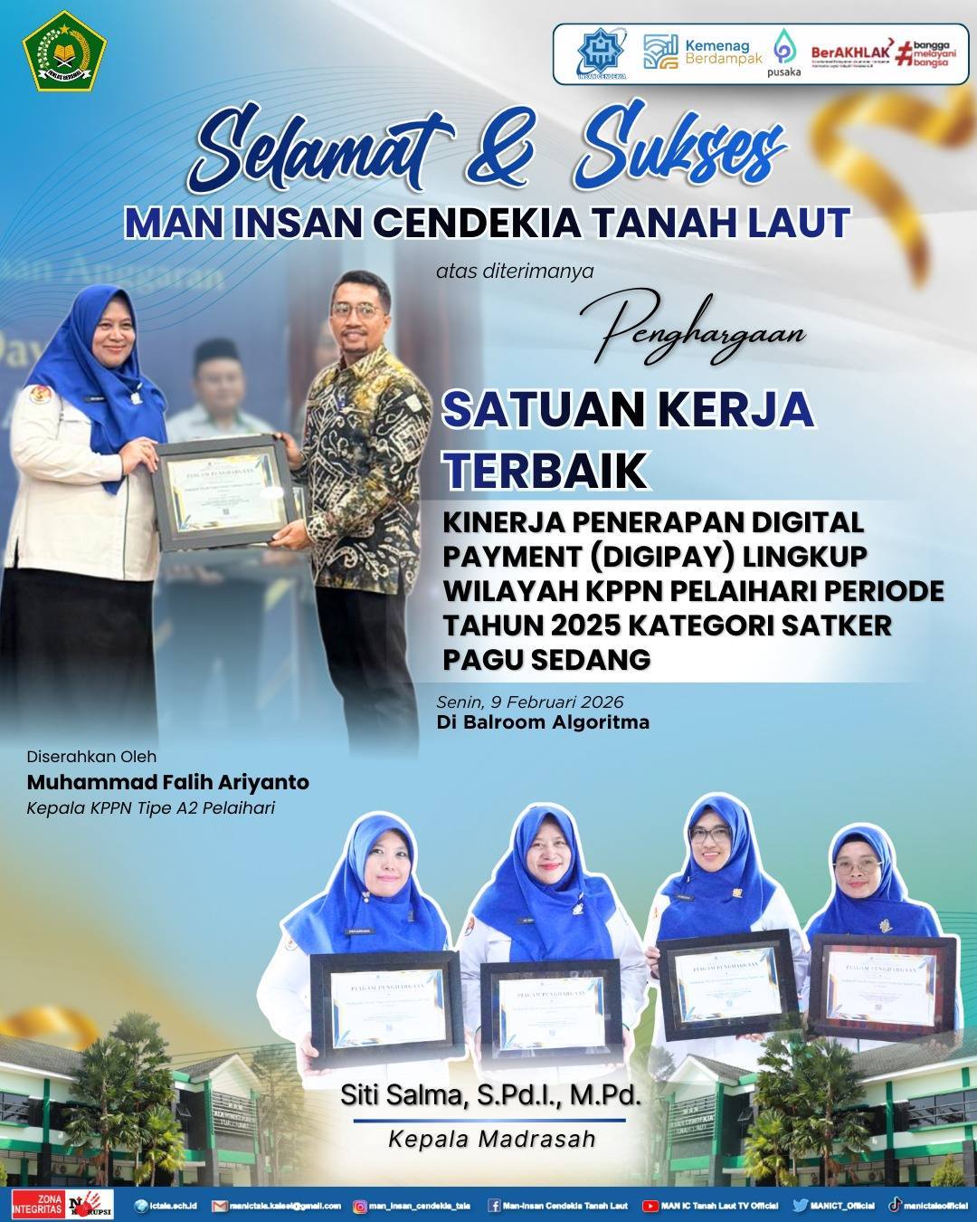 Penghargaan diserahkan langsung oleh Kepala KPPN Tipe A2 Pelaihari, Muhammad Falih Ariyanto, kepada Kepala MAN ICT, Siti Salma, pada Senin (9/2/2026) di Ballroom Algoritma Pelaihari.