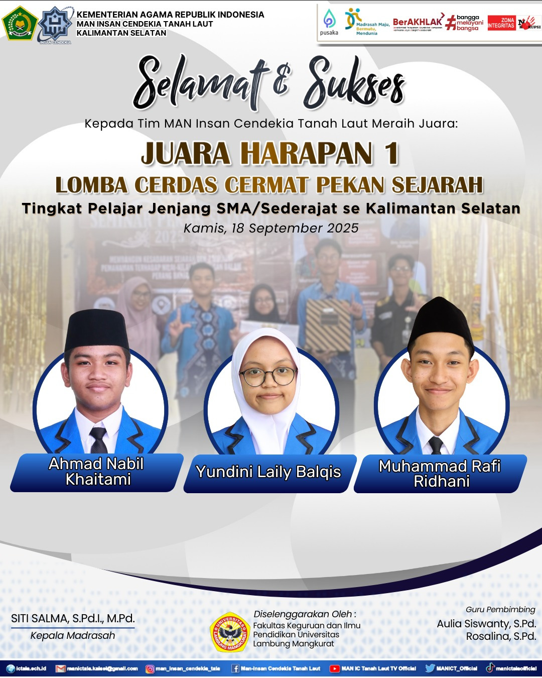 Pelaihari (MAN ICT) — Prestasi kembali ditorehkan oleh siswa-siswi Madrasah Aliyah Negeri Insan Cendekia Tanah Laut (MAN ICT). Kali ini, Tim Cerdas Cermat MAN ICT berhasil meraih Juara Harapan 1 dalam ajang Lomba Cerdas Cermat Pekan Sejarah Tingkat SMA/Sederajat se-Kalimantan Selatan yang diselenggarakan oleh Fakultas Keguruan dan Ilmu Pendidikan Universitas Lambung Mangkura, pada hari Kamis, 18 September 2025.