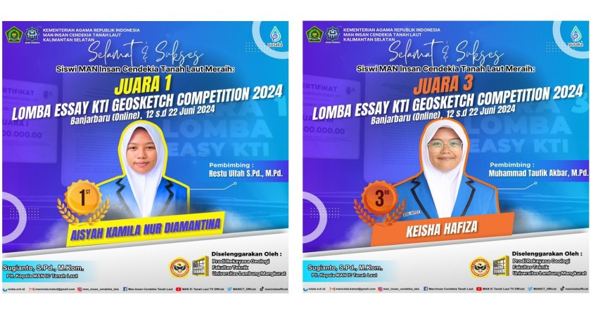Pelaihari (MAN ICT) - Siswa Madrasah Aliyah Negeri Insan Cendekia Tanah Laut (MAN ICT) kembali memborong juara usia berhasil meraih juara 1 dan juara 3 pada lomba Essay KTI Geosketch Competition tahun 2024 yang diselenggarakan oleh Program studi Rekayasa Geologi Fakultas Teknik Universitas Lambung Mangkurat (ULM) Banjarbaru, Rabu (26/06/2024) usai diumumkan via zoom meeting.