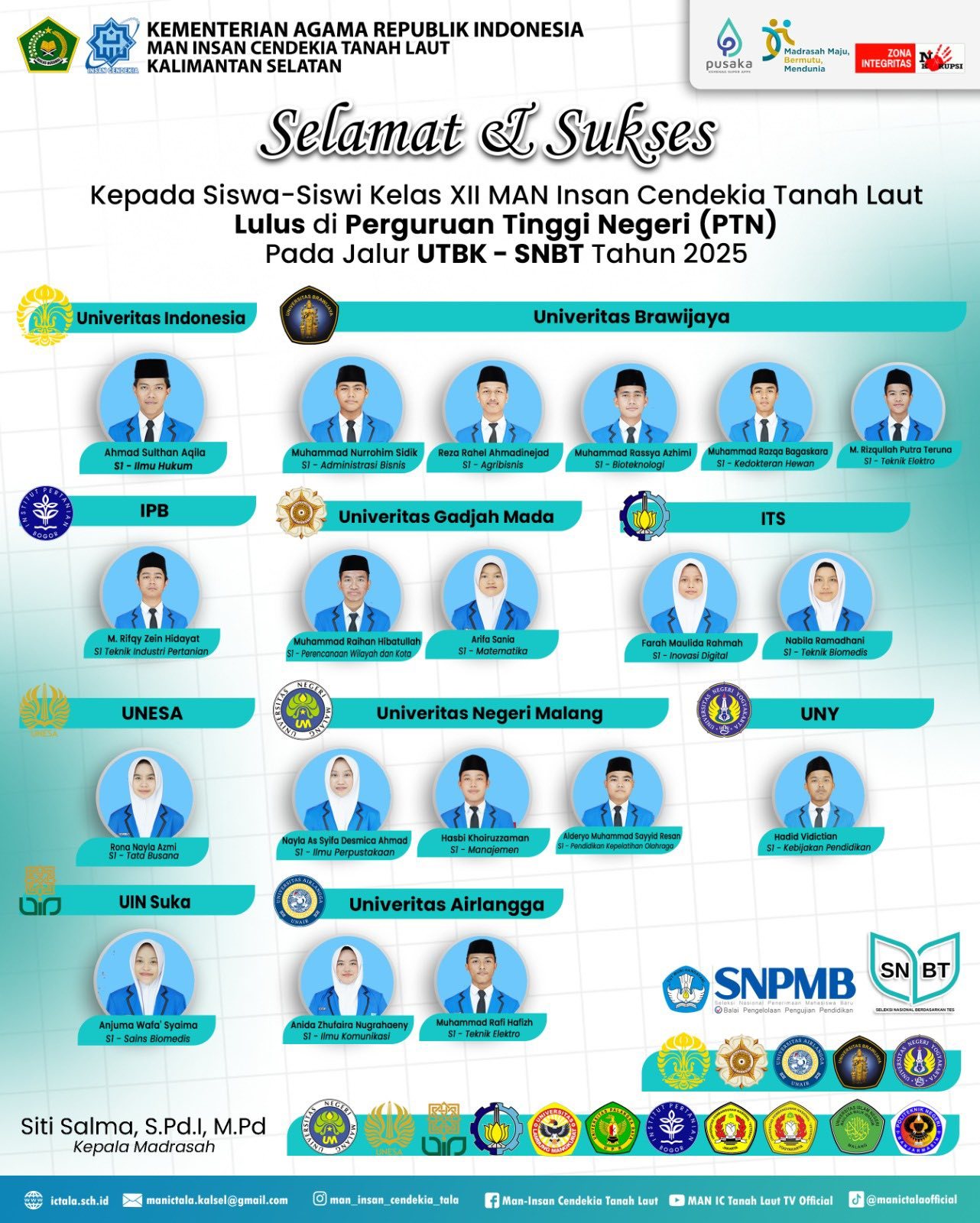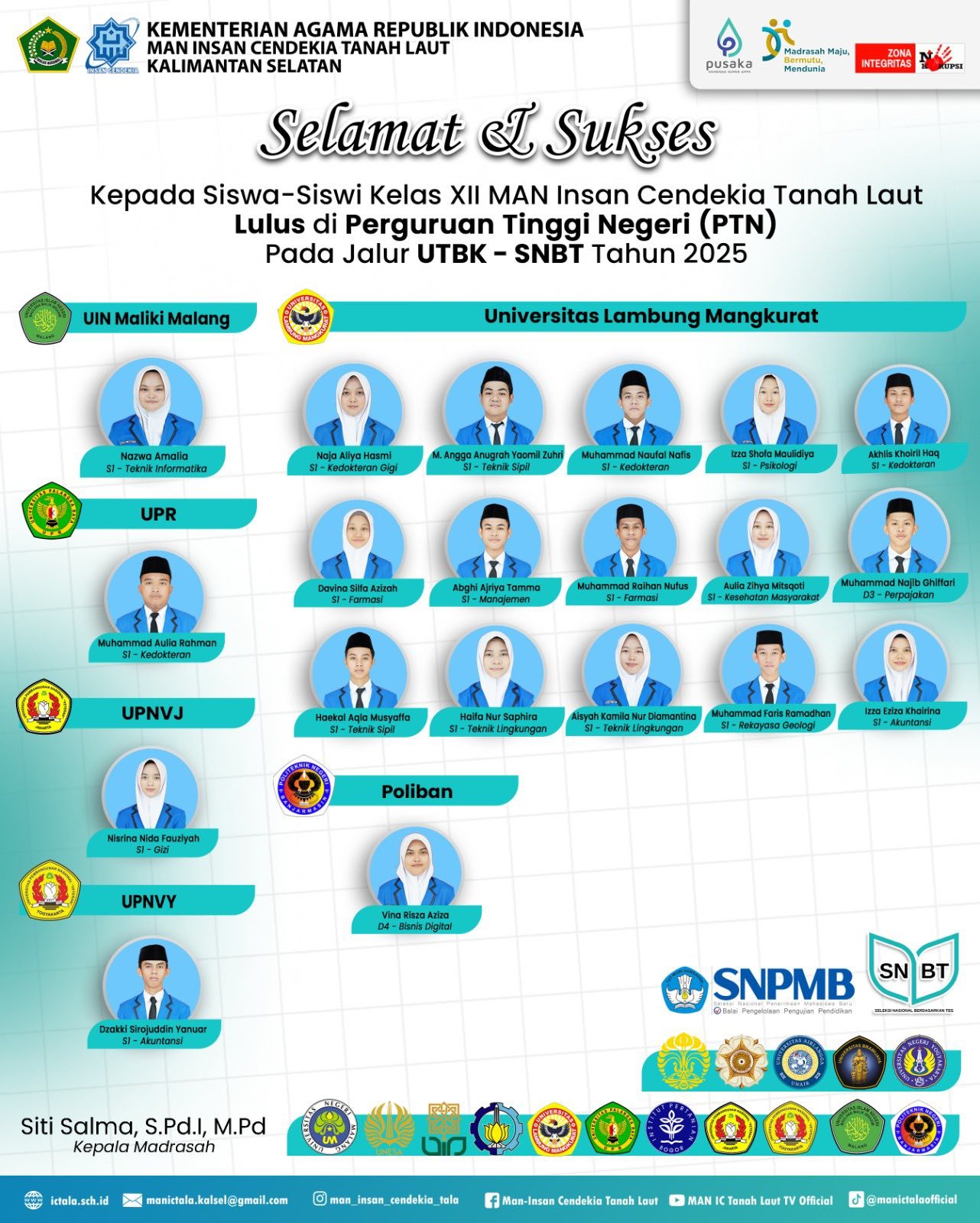 Tanah Laut (MAN ICT). Sebanyak 53 orang siswa Madrasah Aliyah Negeri Insan Cendekia Tanah Laut (MAN ICT)  berhasil meraih prestasi membanggakan dan  diterima di sejumlah perguruan tinggi negeri (PTN) bergengsi di Indonesia, (Rabu 28/05/2025).  Raihan prestasi gemilang para siswa alumni generasi 7 MAN ICT  mencapai angka sebanyak 70,7 % dari total 75 Alumni MAN ICT di tahun ajaran 2024/2025.