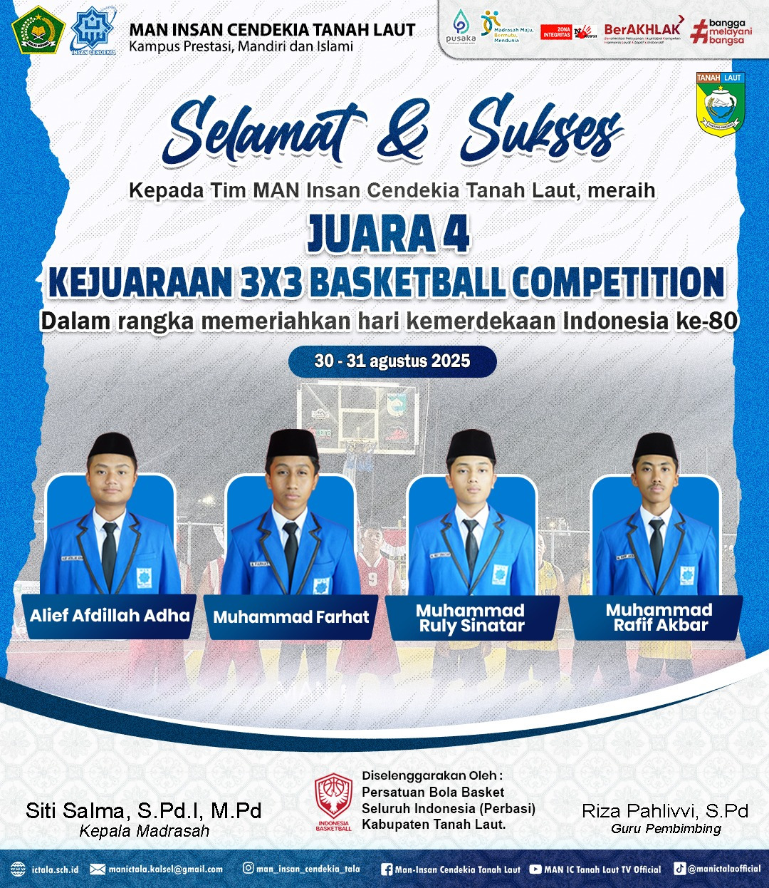 Tanah Laut (MAN ICT) - Tim bola basket Madrasah Aliyah Negeri Insan Cendekia Tanah Laut (MAN ICT) berhasil meraih Juara 4 dalam Kejuaraan 3x3 Basketball Competition yang digelar oleh Persatuan Bola Basket Seluruh Indonesia (Perbasi) Kabupaten Tanah Laut pada 30–31 Agustus 2025. Ajang ini dilaksanakan dalam rangka memeriahkan Hari Kemerdekaan Republik Indonesia ke-80.