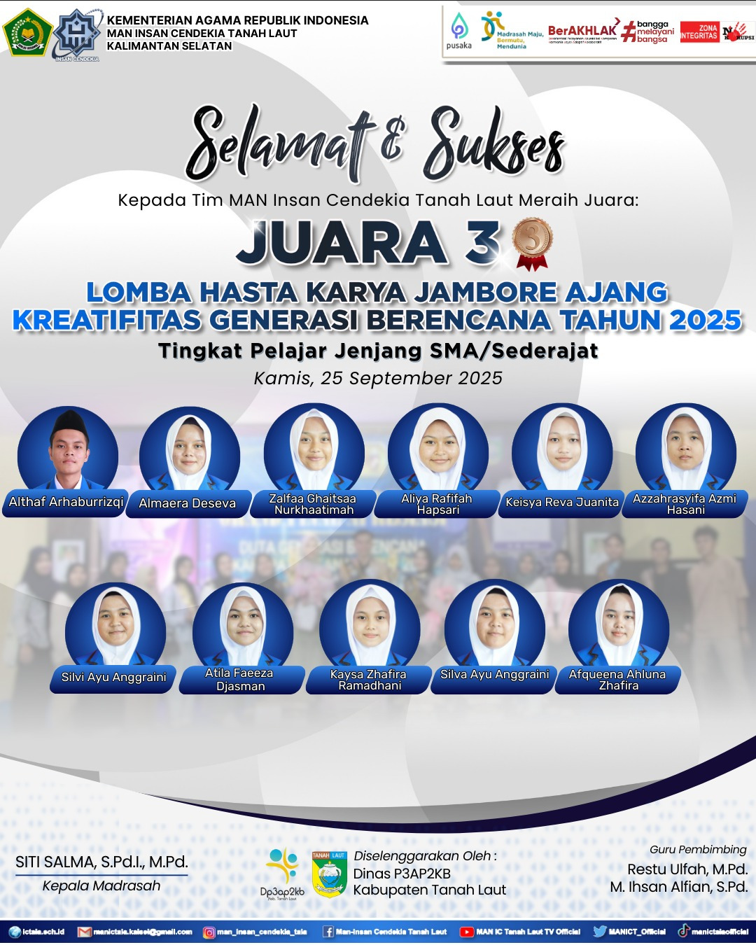 Tanah Laut (MAN ICT) - Tim Madrasah Aliyah Negeri Insan Cendekia Tanah Laut (MAN ICT) berhasil meraih Juara 3 Lomba Hasta Karya pada ajang Jambore Ajang Kreativitas Generasi Berencana (GENRE) Tahun 2025 tingkat pelajar jenjang SMA/sederajat yang diselenggarakan oleh Dinas P3AP2KB Kabupaten Tanah Laut.