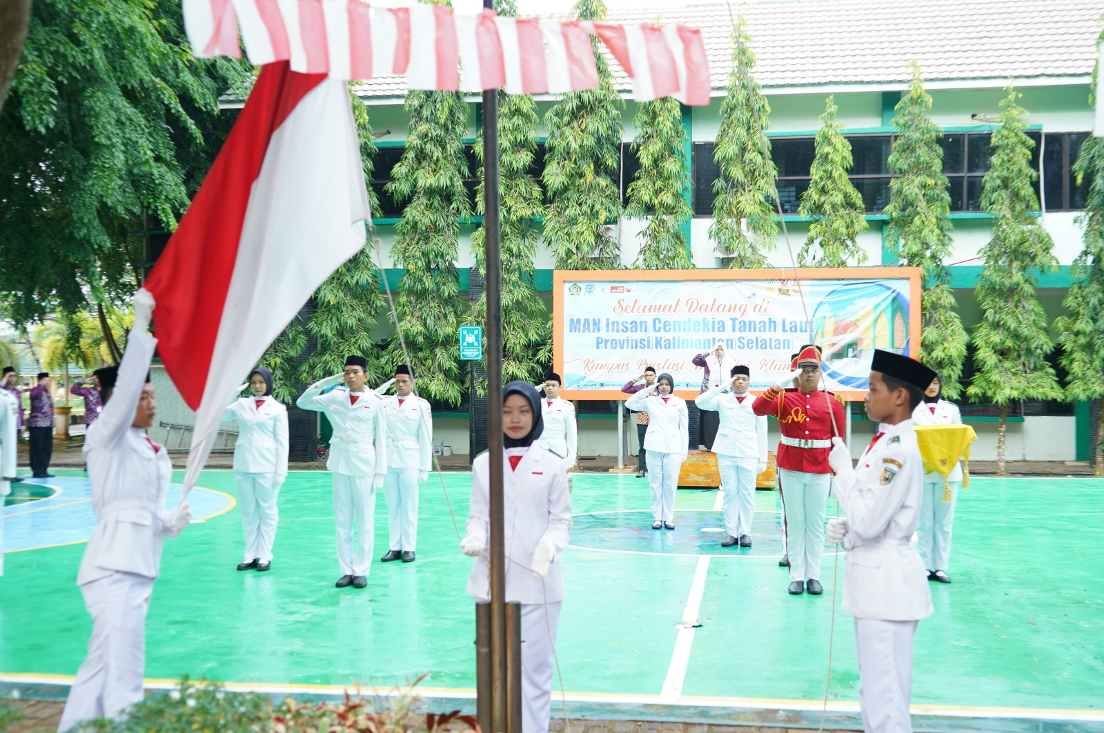 Bertindak sebagai pembina upacara, Kepala MAN ICT, Siti Salma, memimpin jalannya kegiatan. Petugas upacara berasal dari Guru MAN ICT, sementara pengibaran bendera merah putih dilakukan oleh tim paskibra kelas X yang tampil penuh disiplin. Suasana hening dan khidmat menyelimuti lapangan saat detik-detik proklamasi diperingati.